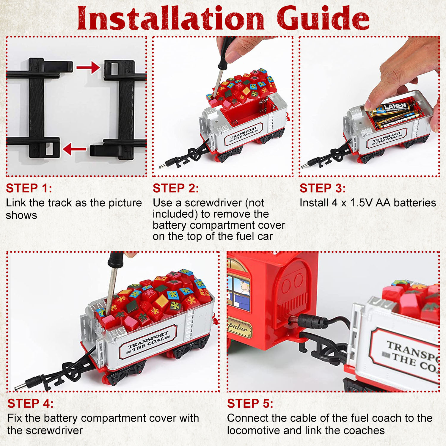 • *Realistic Music And Light*: When running around on the track,this Christmas train features realistic sounds of authentic engine sounds and locomotive’s horns,and a headlight that lights up. The realistic sounds and light can easily bring kids back to the age of steam,where there was no internet,no TV,no smartphones,and no air travel. Only trains undertook exchange of goods and industrial material.
