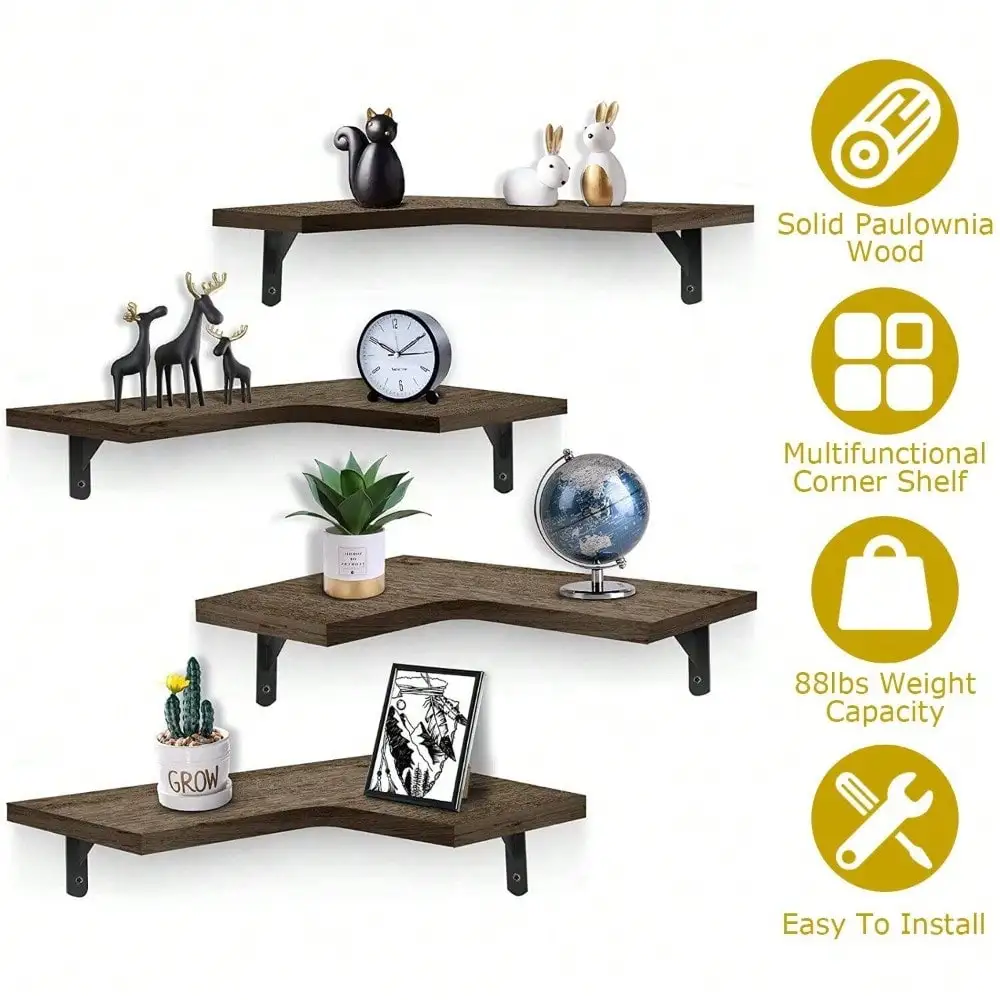Creative Corner Shelves:A perfect combination of floating and corner shelves. This floating shelf fully utilizes the blank corner and turnings to maximize storage and save valuable floor space. Make everything neatly organized and easily accessible.